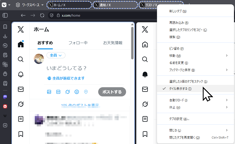 こちらは「Vivaldi」というブラウザに標準搭載されている「タイリング(タイル表示)」機能を利用してマルチカラムを実現する方法です。