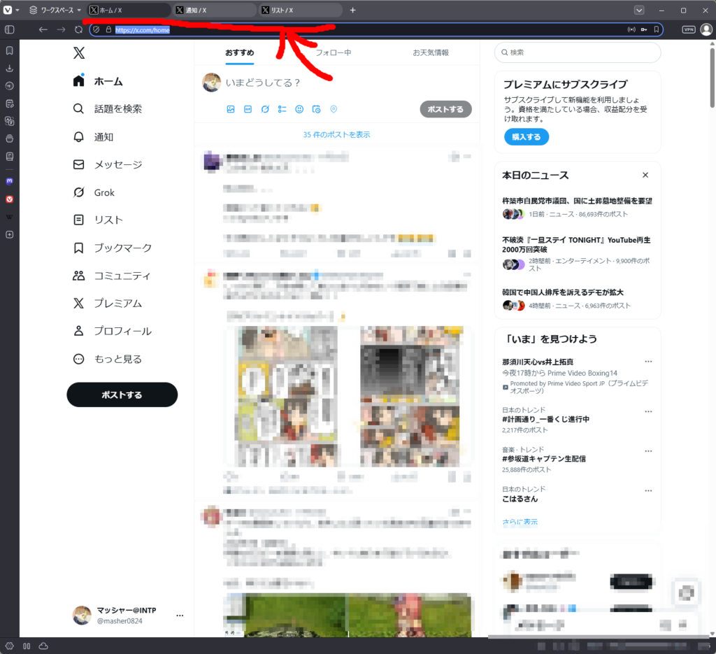 - カラムとして並べたいページ(ホーム、通知、リストなど)を、それぞれ別のタブで表示させます。